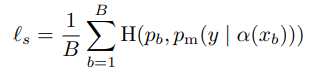 FixMatch의 Loss 함수는 두 가지로 구성됩니다. 하나는 Supervised loss l_s 이고 다른 하나는 Unsupervised loss l_u 입니다. l_s는 단순히 weak augmentation이 적용된 cross-entropy loss 이며 식 (3) 과 같습니다.
