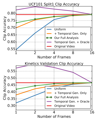 Fig 5에서 Original video는 기존 방식으로 16개의 frame으로 C3D를 평가한 것을 의미하며, Uniform은 이들을 Uniform하게 sub-sampling만 하여 보인 성능을 의미합니다. 단순 motion 정보를 제거한 Uniform의 결과를 Original video와 비교하였을 때 sub-sampling한 frame의 수가 줄어듬에 따라 성능 하락 폭이 큰 것을 보이며, 이를 통해 motion 정보는 성능에 꽤 큰 영향을 주고 있음을 확인할 수 있습니다. 그러나 Temporal Gen. Only 를 통해 Class-Agnostic Temporal Generator를 활용하여 motion 정보의 보완이 이루어진다면 성능 하락 폭이 각각 UCF101 : 35%->10%, Kinetics : 15%->9% 로 줄일 수 있음을 확인할 수 있습니다. 또한, Class-Agnostic Temporal Generator 을 사용하기 위한 sub-sampling 시, motion-invariant한 frame을 뽑기 위해 Max Response 방법론을 추가하여 사용했을 때, Our Full Analysis에서 확인할 수 있듯이 성능 하락 폭이 좀 더 줄어 motion 정보를 대부분 대체할 수 있음을 알 수 있습니다. 그리고 Temporal Gen.+Oracle의 성능이 Original Video의 성능을 뛰어넘은 것을 통해 이상적인 상황에서 frame selection이 이루어진다면 motion 정보는 대체될 수 있음을 보이며, 앞으로 keyframe selection 연구에 대한 중요성 또한 시사합니다.