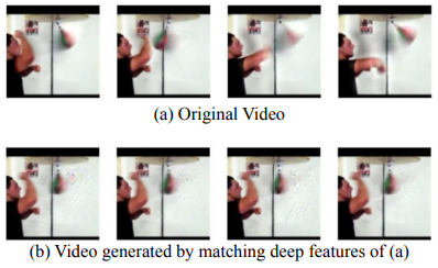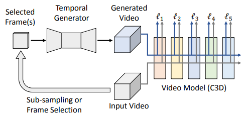 Action recognition 분야에서는 이를 위한 모델을 학습시킬 때 Video 에서 일정 frame을 추출하고 (주로 16 frame), 이를 입력으로 class에 대한 label을 주어 임의의 모델을 학습시키곤 합니다. 16 frame은 UCF101이나 Kinetics 같이 평균 길이가 10초 이내인 Video dataset에서는 frame 간의 motion 정보를 얻어내기 충분한 양이며, 여기서 얻은 결과에는 Temporal 정보와 Spatial 정보가 entangle되어 있게 됩니다. 이러한 결과에서 motion 정보의 효과를 확인하고자 Class-Agnostic Temporal Generator에서는 16 frame 중 일부 frame을 sub-sampling 하여 입력으로 사용하여 C3D를 학습하였을 때의 성능을 비교하였습니다. 그리고 Sub-sampling된 frame을 사용할 시 입력의 개수를 맞춰주기 위해 CycleGAN의 generator를 확장시켜 사용하며, Generator로 만든 synthesized video가 sub-sampling 된 frame으로 제거된 motion 정보를 보완하기 위한 frame 생성을 위해, Generated Video와 기존 Video를 입력으로 각각 사용할 때의 비슷한 feature representation을 돕는 Perceptual Loss로 Generator를 학습시킵니다. 이는 Convolution layer에서 높은 invariance를 지니는 high-level feature의 특성에서 영감을 받았으며, Fig 3에서 이를 정성적으로 나타냅니다. 그리고 Perceptual Loss를 사용하여 sub-sampling 된 frame로 synthesized video를 만드는 generator를 학습시키기에 해당 video에 대한 class는 따로 제공되지 않으며 이와 같은 이유로 Class-Agnostic Temporal Generator라고 불리웁니다.