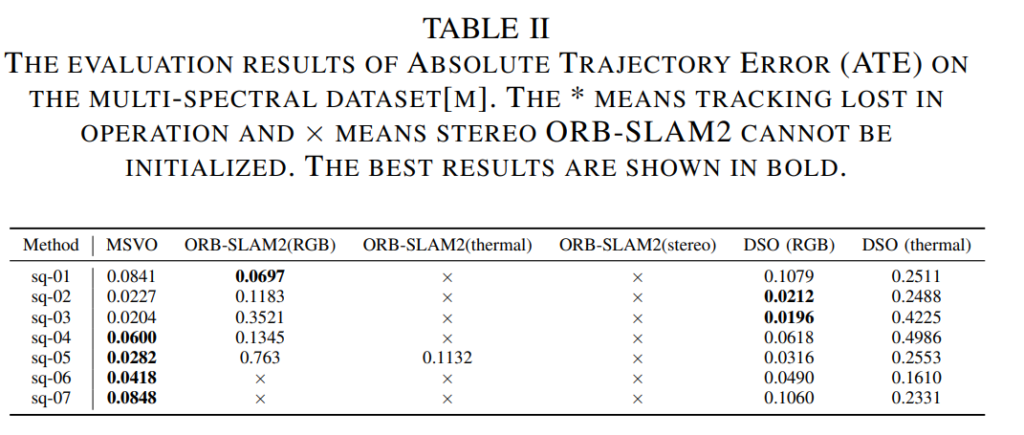 위의 x 표시들은 initialized를 실패하여 애초에 측정을 못한 경우 이다. 근데 DSO에서는 RGB와 Thermal에서 결과 도출을 하였고, RGB인 경우 제안된 방법과 유사한 성능 혹은 더 나은 성능을 보여주기도 한다.
