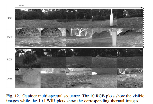 해당 방법에서 사용된 데이터 셋의 예시는 Fig 12와 같다. 해당 논문에서 아쉬운 점은 motive에서 말한 Multi-Spectral VO의 한계를 극복하기 위한 방법을 제안한 논문이지만, 실제로는 RGB를 베이스로 LWIR의 값을 참고한 방법과 같다고 생각한다. 그렇기에 RGB만 이용한 DSO와 성능이 유사한 결과가 나왔다고 본다.