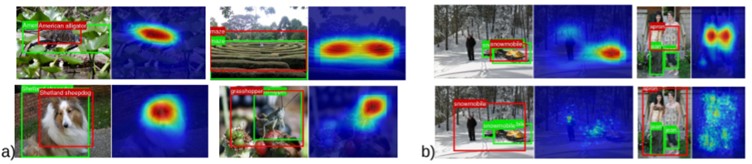a)는 GoogleNet-GAP에서의 localization 예시이고, b)는 GoogleNet-GAP와 기존 localization을 위한GoogleNet의 비교입니다. (위:GoogleNet-GAP, 아래: GoogleNet)
