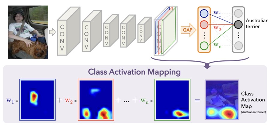 Class activation map(CAM)은 각 이미지에 대해 생성된 weighted map을 말하는데 간단히 하자면 모델이 이미지에서 어디를 보고 있는지를 나타내는 map입니다. 특정 카테고리에 대한 CAM은 그 카테고리를 식별하기 위해 사용된 이미지에서의 discriminative한 영역을 나타냅니다.