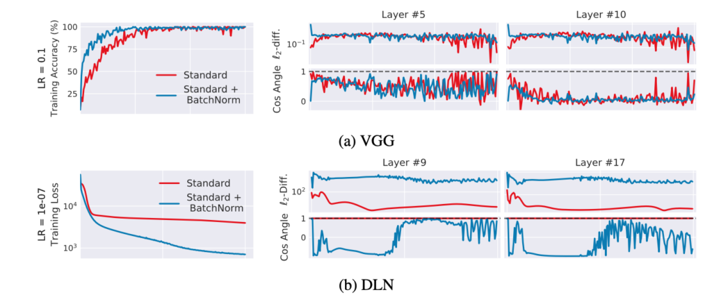 (a) VGG network에서는 사실상 비슷하다고 볼 수 있고 , (b) DLN에서는 오히려 더 안좋아 진것을 확인할 수 있습니다. (Cos Angle , 두 Gradient의 사잇각이 클 수록 0에 가까워지고 이는 두 벡터가 비슷하지 않다는 것을 의미합니다.) 이는 BatchNorm과 ICS가 상관이 없다는 사실을 의미합니다.