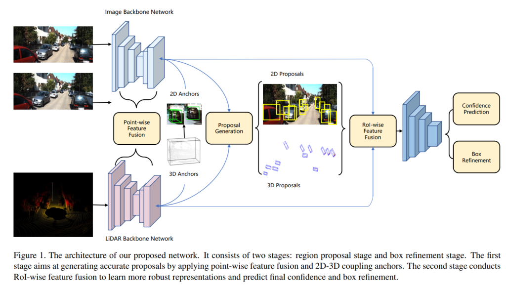 본 논문에서는 2D 이미지와 3D Point Cloud의 각 장점을 모두 살릴 수 있도록 Fusion을 수행하여 3D Detection을 수행하는 논문입니다. 저자는 2D 이미지는 풍부한 Semantic 정보를 가지고 있으며, 3D Point Cloud는 distance 정보를 가지고 있어 각각의 장점을 모두 잘 살릴수 있도록 각 모달리티를 잘 합치면 더 좋은 3D Object Detection이 가능하다고 이야기합니다. 그리고 저자는 두 모달리티를 잘 Fusion하는 2-stage Architecture를 제안합니다. 본 논문에서 제안하는 아키텍처는 입력으로 binocular(아마도 스테레오…?) 이미지와 raw point clouds를 받으며, 3D Detection 결과를 나타내게 됩니다. 자세한 설명은 뒤에서 다루겠습니다.