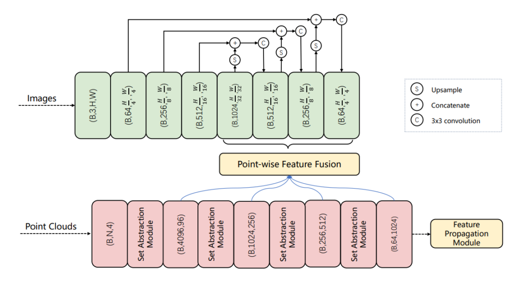 위의 그림에서 2D Image와 3D Point Clouds의 feature를 추출하는 내용은 쉽게 이해하셨을 것이라고 생각합니다. 그럼 이 두 Feature를 point wise feature fusion을 수행한다는데, 정확히 어떻게 수행하는걸까요? 먼저 X,Y,Z coordinates of points를 4개의 그룹에서 추출합니다. 그리고 해당 포인트를 image feature mpa으로 proection 한다고 합니다. 예를들면 point의 그룹 사이즈가 1024였다면 image featuremap은 (1024,H/32,W/32)로 프로젝션 시켰다고 합니다. 여기서 Pointnet의 방법을 잘 모르시면 헷갈릴수도 있는데 이또한 이전에 리뷰한 글에서 확인하시면 됩니다. (링크)