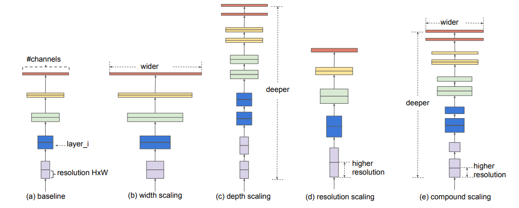 Scaling은 Filter의 채널수(width)를 늘리거나 , Layer수(Depth)를 늘리거나 , Input-size(Resolution)를 늘려주는 방법들로 구성이 됩니다.