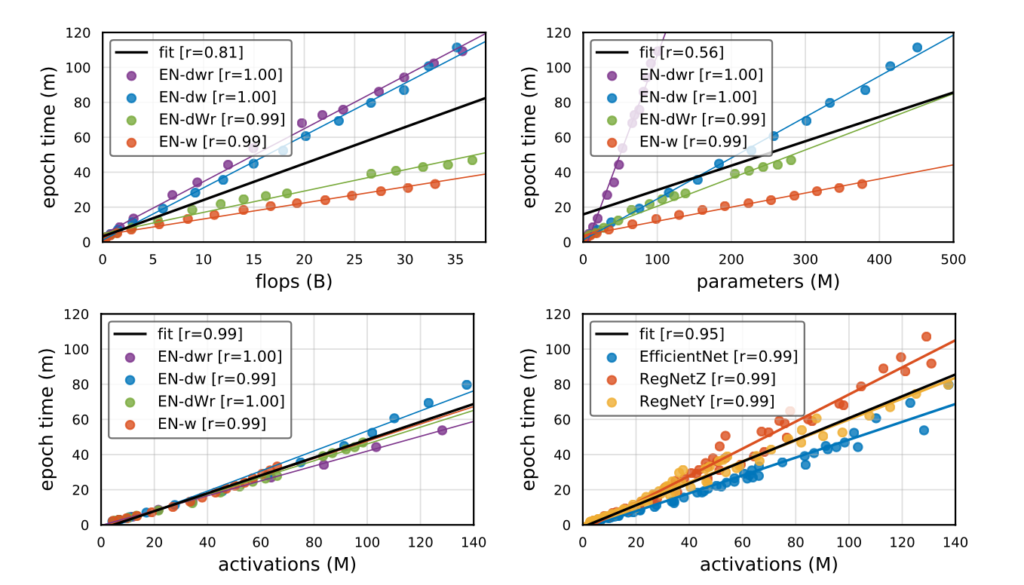 r 은 Pearson Correlation 를 계산한 것이며 flops , parameters , activations 들과 Runtime 간에 관련성을 나타내줍니다.