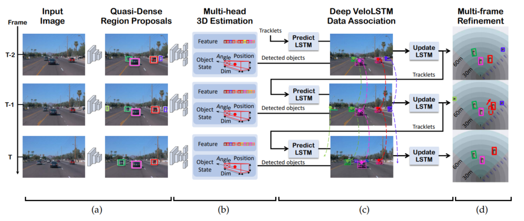 해당 논문의 저자는 online 3D tracking framework를 제안합니다. 해당 프레임워크는 3D object의 검출과 추적(track)을 동시에 수행하는 것이 특징입니다. 해당 모델은 가장 먼저 Faster RCNN을 통해서 RoI를 추출하고, 해당 ROI를 이용해 3D properties를 예측합니다. 여기서 3D properties는 3D bounding box center, depth, dimension, orientation 입니다. 또 추가로 해당 프레임 워크는 quasi-dense similarity learning으로 instance descriptor vector를 만들도록 학습한다고 합니다. quasi dense similarity learning은 뒤에서 설명하겠지만 결론적으로 같은 car라는 class에서도 실제 두 프레임에서 동일한 차가 어떤 것인지 구별할 수 있는 vector를 학습한다고 생각하시면 됩니다. 그리고 추가적으로 Tracking에서 occlusion과 reappearance가 발생할 때 robust하지 못한 문제를 해결하기 위해 motion-aware association과 depth ordering matching algorithm을 새롭게 적용합니다. 마지막으로 instances의 움직임(movement)을 캡처하고, 3D pose를 업데이트 하기 위해 VeloLSTM을 제안합니다. (VeloLSTM은 2편에서..) 이러한 전체적인 내용이 담긴 프레임워크는 다음과 같습니다.
