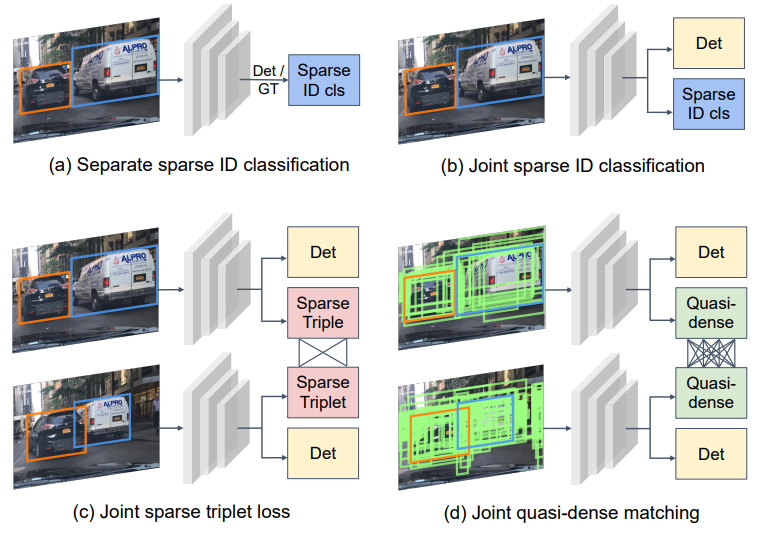 가장 나이브한 방법으로는 그냥 우리가 사용하는 GT bbox를 가지고 각각 ID cls를 부여해서 모델을 학습하는 방법이 있을 것입니다. 이는 위에서 그리 (a)와 같습니다. 그리고 여기서 조금더 나아가 (b) 와 같이 Detection과 ID Classification을 joint 한 방법론도 있습니다. 그리고 위에 그림을 설명하는 논문인 ‘ Quasi-Dense Similarity Learning for Multiple Object Tracking ‘ 에서는 모델이 예측한 Proposal들을 가지고 Desnse하게 ID를 분류할 수 있는 방법을 제안합니다. 해당 내용은 다시 리뷰중인 논문의 그림을 가져와서 더 자세히 설명하겠습니다.