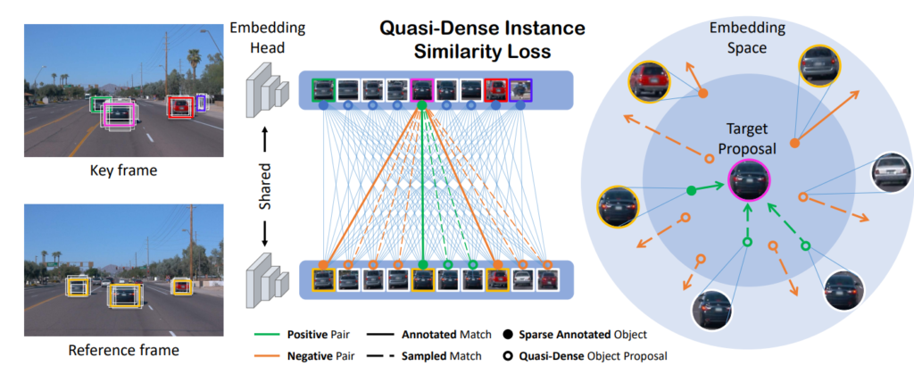 먼저 저자는 여러 시퀀스의 이미지에서 동일한 instance를 정확하게 찾아야 tracklets(궤적?)을 찾을 수 있기 때문에 동일한 instance를 찾기 위해 contrastive loss를 사용한 quasi-dense proposals을 적용합니다. 해당 방법은 저자도 잘 설명하고 있지만 먼저 발표된 논문이 더 잘 와닿아서 해당 그림을 가지고 설명하겠습니다.