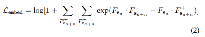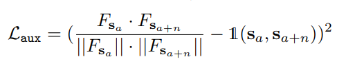 기본적인 형태는 크로스 엔트로피의 형태를 띄고 있으며 위의 수식에서 +,- 는 Postive와 Negative를 F_s는 emvedding feature를 그리고 s_a는 key frame이며 n은 해당 프레임에서 앞뒤 n장 이미지를 의미합니다. 해당 부분에서 목표는 positive 임베딩 벡터간의 코사인 유사도는 최대가 되며(가까워지며) Negative 임베딩 벡터간의 코사인 유사도는 최소가 되도록 모델을 학습한다고 합니다. 이를 위해서 추가적인 Loss를 추가하며 이는 다음과 같습니다.