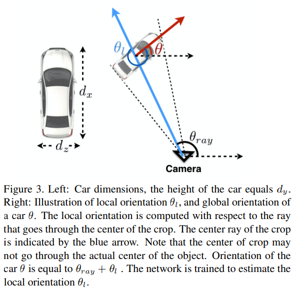 여기서 Dimension은 3D Box에서 차량의 크기를 의미하며, angle은 위의 그림에서 θ_l을 의미합니다. θ_l를 모델이 예측하면 차량의 Global 방향을 얻을 수 있다고 합니다. 여기서 ray는 논문에서 다음과 같이 설명합니다.