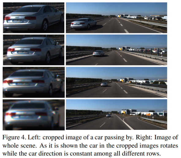 We thus regress to this local orientation θl . Fig. 4 shows an example, where the local orientation angle θl and the ray angle change in such a way that their combined effect is a constant global orientation of the car. Given intrinsic camera parameters, the ray direction at a particular pixel is trivial to compute. At inference time we combine this ray direction at the crop center with the estimated local orientation in order to compute the global orientation of the object.