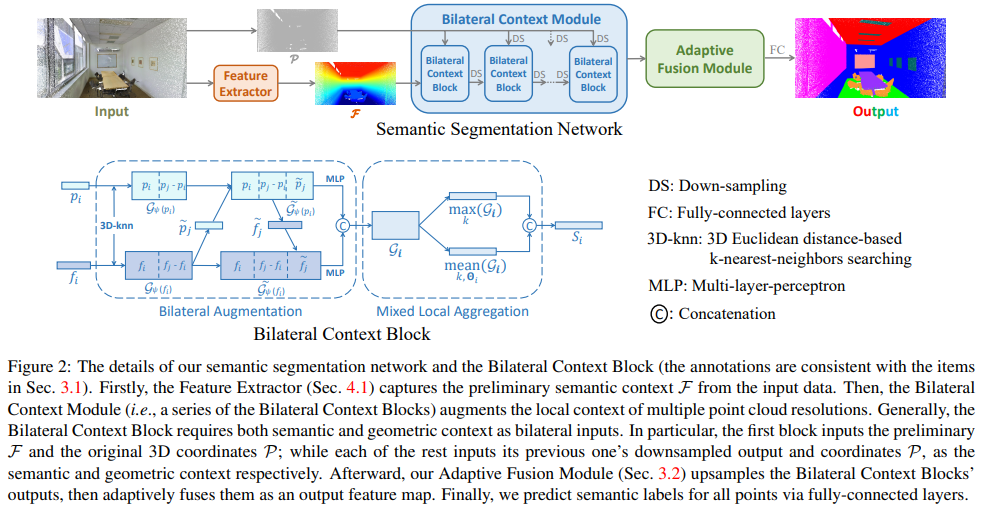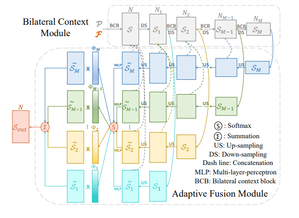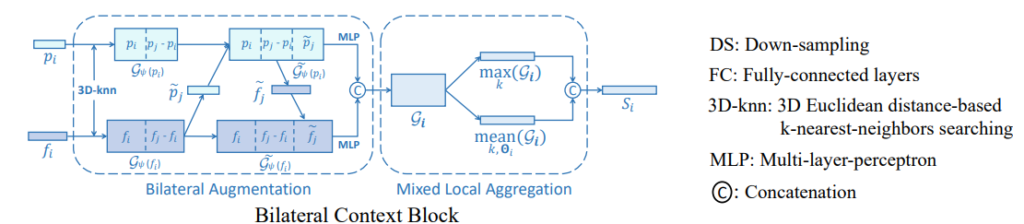 그 다음, 아래의 수식과 같이 geometry 정보와 feature 양측면의 정보가 고려된 Bilateral Augmented context를 생성함으로써 두 정보간의 애매모호한 관계를 해소합니다.