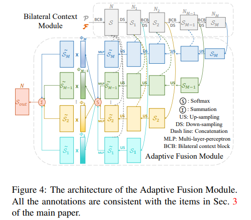 약간의 다른 부분은 Point-level에서의 정보를 획득하기 위해서 마지막단 feature map을 모두 결합, MLP를 태운 후, SoftMax를 적용합니다. 그 후, 마지막단 레이어에 곱해주어 Self-attnetion과 같은 효과를 가집니다. 그 후, 모든 feature map를 더해 geometry와 context(color) 양측면이 고려된 정보와 스케일이 고려된 최종 feature map S_{out}를 획득합니다.