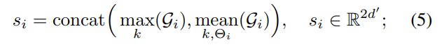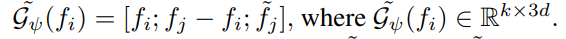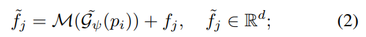 수식 (2)에서는 geometry 정보를 이용하여 feature를 예측하는 MLP를 이용하여 이웃 feature 정보 fj를 결합함으로써 양측면을 고려한 이웃 feature ~fj를 만듭니다.
