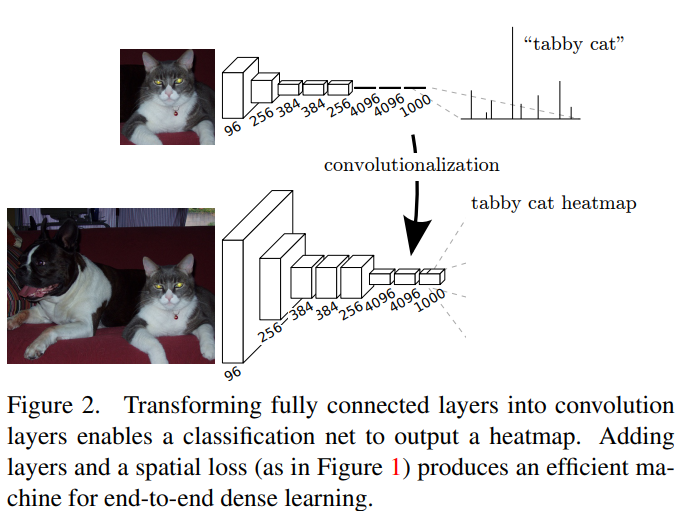 기존의 모델은 fully connected layer로 인해 input 사이즈가 고정되어있었고 non-spatial(공간 정보가 사라진)한 output을 산출한다. 이러한 fully connected layer가 전체 영역을 보는 kernel을 이용하면 convolution으로 볼 수 있다.