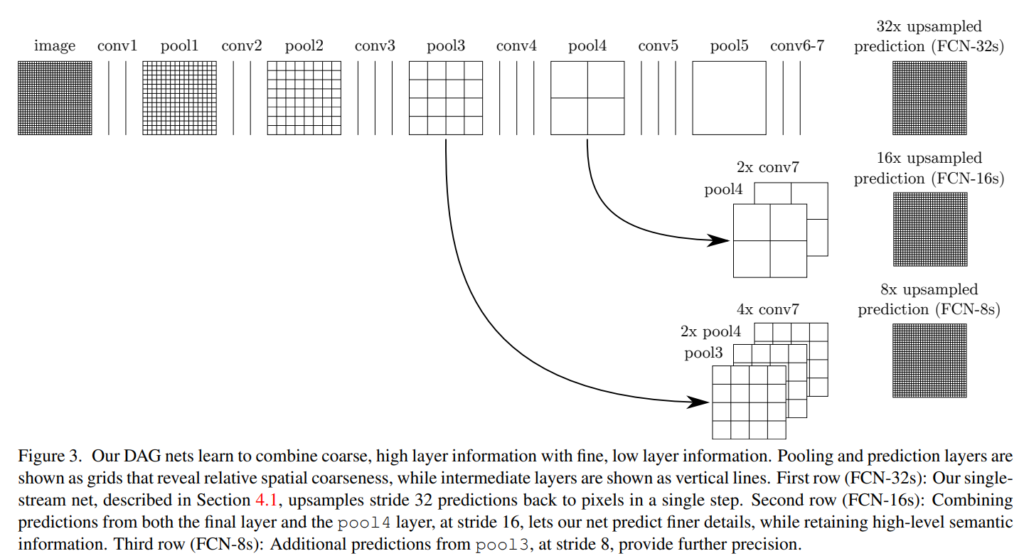 pool 4와 conv7(fully connected → fully convolution된 레이어)의 2 x upsampling을 fuse한 것의 prediction과 16 x upsampled prediction을 합치고, pool3과 pool4의 2 x upsampling과 conv 7의 4 x upsampling을 fuse한 것의 prediction과 8 x upsampled prediction을 합친다.