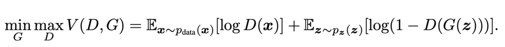 introduction에서 알아본 것 처럼 Generator와 Discriminator는 서로 상반된 입장을 가지고 있습니다. 이러한 상항을 다음과 같은 Function으로 나타낼 수 있습니다.