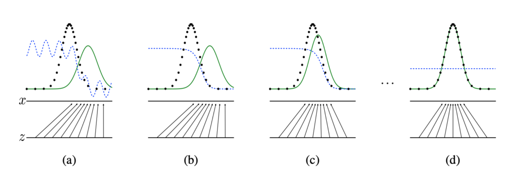 학습의 과정을 간단하게 보여주는 그림입니다. (검은색 분포 : real data , 파란색 분포 : discriminator의 확률 분포)