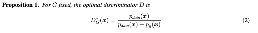 이를통해 Optimal Discriminator = D^{{}\ast_{{}} }_{G}(x)=\frac{p_{data}(x)}{p_{data(x)}+p_{generator}(x)} 임을 확인할 수 있습니다.