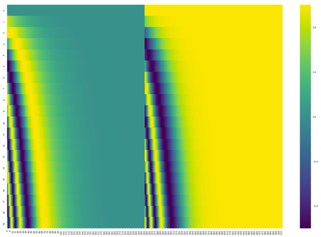 그림1은 positional encoding 벡터를 시각화 한 그림으로, y축은 단어의 개수(총 20개)를 나타내며 x축은 해당 positional encoding vector의 길이 (512)를 의미합니다.