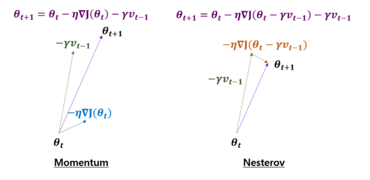 Momentum 방식에서는 momentum 방향과 Gradient 방향을 각각 구한뒤 합쳐주는 방식이지만 Nesterov 방식에서는 일단 Momentum 방향으로 먼저 움직여주고 그 자리에서 Gradient 방향으로 update하는 방식을 취하고 있습니다. 이렇게 하면 어떤 점이 좋냐 먼저 Momentum 같은 경우에는 멈춰야 하는 시점임에도 불구하고 관성으로 인해 멀리 벗어날 수 있다는 단점이 존재합니다. 하지만 NAG 같은 경우는 momentum 방향으로 움직이고 그 자리에서 어느 방향으로 이동 할지를 결정하는 구조이기 때문에 보다 더 신중하다고 볼 수 있습니다.