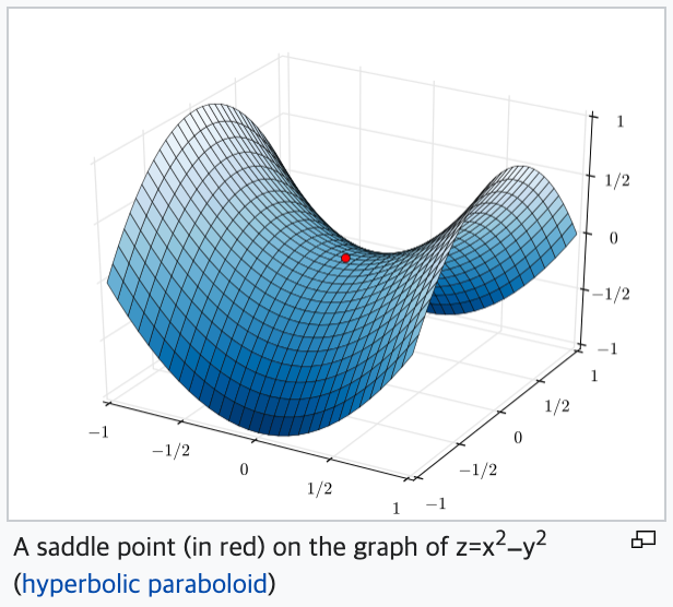 - Global Optimum이 아닌 local minima와 안장점(saddle point) 빠질 위험이 있습니다. 안장점은 평면으로 둘러싸여 있어 기울기가 0인 지점을 의미합니다. 이런 안장점을 빠져나오는 데에도 Gradient Descent가 힘을 못쓴다고 합니다.