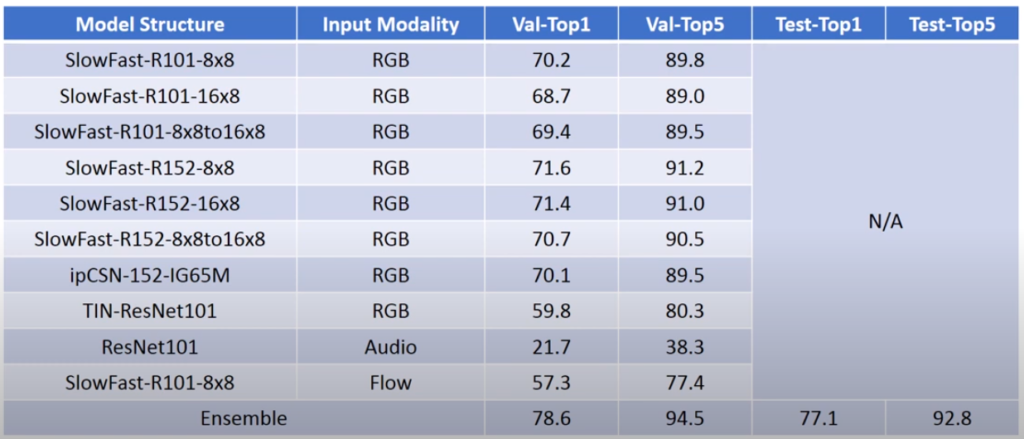 CUHK-Sensetime 팀은 여러 챌린지에서 많이 사용하는 Ensemble 방식으로 당시 성능이 좋았던 여러 방법론에 적용하여 높은 성능을 나타냈습니다. Ensemble 한 방법론으로는 프레임 단위 clip을 입력으로 받은 SlowFast, CSN, TIN이 있으며, 이들 뿐만아니라 Audio와 Optical Flow를 각각 입력으로도 하여 Ensemble에 추가하였습니다.