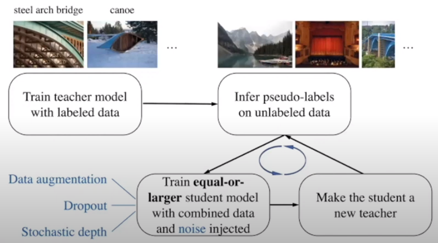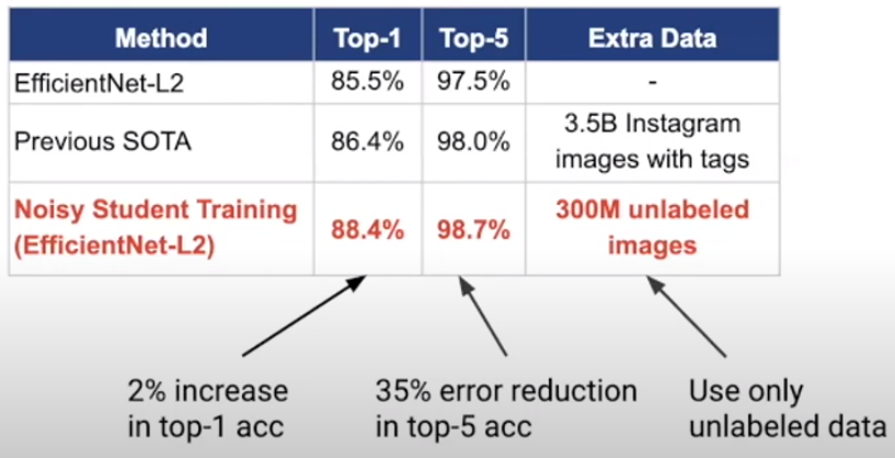 EfficientNet-L2가 각 프레임 별로 Spatial 한 정보를 주기 위해 사용되기에 앞서 ImageNet 데이터 셋으로 학습된 teacher 모델을 통해 Self-supervised Learning 방식의 일종인 Pseudo-Labeling 과정이 추가되어 label이 없는 3억개의 이미지 데이터로 학습을 진행하였으며 ImageNet에서 당시 SOTA를 뛰어 넘는 높은 성능을 보였습니다.