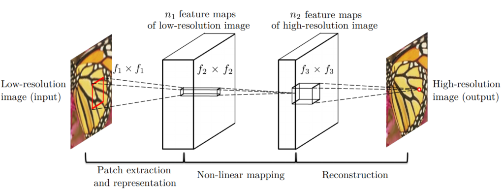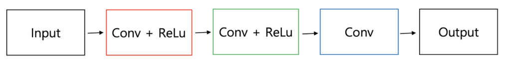 정리하면, 아래 그림과 같이 각각의 단계는 Convolution Layer로 구성된다. 첫 번째 layer에서는 저해상도 이미지로부터 feature를 추출하고, 두 번째 layer에서는 고차원의 vector들을 feature mapping을 하며, 마지막 layer에서 feature로부터 나온 결과를 image로 복원한다.