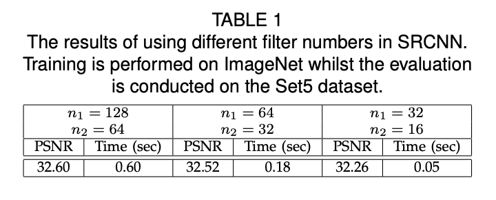 TABLE1은 fiter 수에 따른 결과로 filter의 수가 증가하면, PSNR이 증가하여 화질 개선은 더 잘 이루어지지만, 학습 시간이 증가한다.
