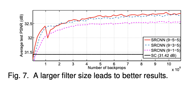 Figure 7은 filter size에 따른 결과로, filter의 크기가 커지는 것과 비례하여 PSNR의 평균이 높아지므로 화질이 향상됨을 확인할 수 있다.