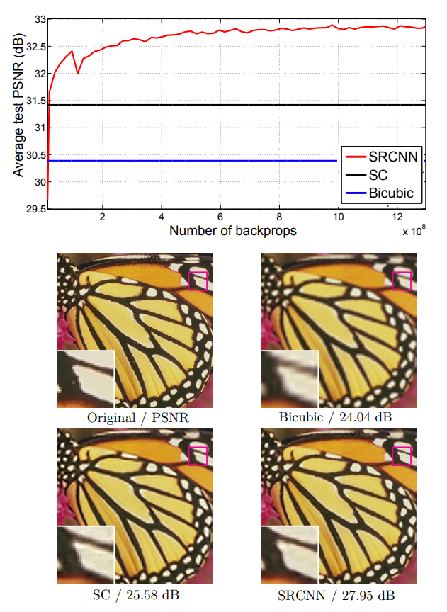 위 그래프는 Original, Bicubic, Sparse-coding-based method(SC), SRCNN에 대한 PSNR을 나타낸 그래프이다. 그래프에서 확인할 수 있듯, SRCNN의 PSNR이 가장 높다.