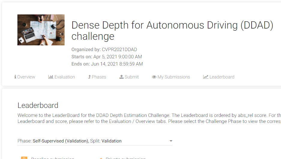 이번 챌린지에서 제공하는 데이터셋은 DDAD(Dense Depth for Autonomous Driving) 으로 소개할 논문에서 공개된 데이터셋입니다. 이 데이터셋과 함께 공개된 방법론이 Self-Supervised 이고 Semi-Supervised 에서 실험도 해서 그런지 대회도 두가지 테스크로 나눠서 성능을 체크합니다. 저는 Self-Supervised를 먼저 시도 해볼 예정 입니다. 그 외에 데이터셋에 0대한 설명은 아래에서 다루도록 하겠습니다.
