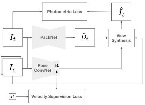 제안된 모델 PackNet의 아키텍쳐는 다른 최근 Self-Supervised Depth Estimation 방법론들과 동일한 양상을 띄고 있다. 보면 기준 영상을 생성 모델로 Depth를 얻고 기준 영상의 앞뒤 영상을 PoseNet에서 얻은 pose정보를 이용해 기준영상을 생성하고 비교를 한다. 이 아키텍쳐에서 다른 모델들과의 차별점은 뎁스 생성보델 PackNet과 보다 정확한 Rt 생성을 위한 Velocity Supervision Loss라고 보면 된다. Loss 또한 Velocity Supervision Loss외에는 monodepth2와 거의 동일하다고 생각하면 된다.