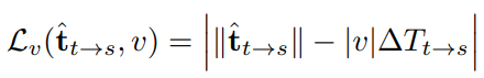 최근 많은 시스템들은 순간 속도정도는 잴 수 있는 센서를 갖추고 있다 따라서 속도를 이용한 로스 설계는 유의미하다고 한다. 따라서 예측된 translation 즉 위치 값들과 GT로 실제 속도 값을 이용하는 것은 가능하다고 할 수 있다. 그럼 속도를 어떻게 이용했는지 보면 다음 식을 보면된다.