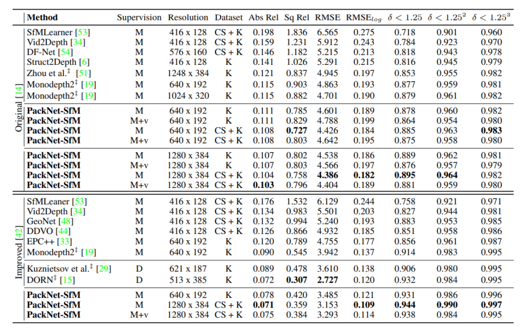 1. PackNet이라는 Depth Estimation을 위한 새로운 뉴럴 아키택쳐를 제안합니다. packing과 uppacking 블록을 제안하며 이는 3D 컨볼루전을 활용해 조밀한 외관과 기하학적 정보를 최대한 학습할 수 있도록 합니다.