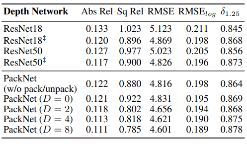 PackNet의 Ablation Study 결과이다. 단순히 Resnet을 사용했을 때와 packing을 점점 넣을 수 록 성능이 향상 되는 것을 볼 수 있다.