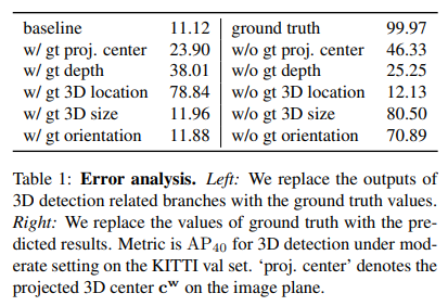 위에 그림을 보시면 AP(40)에서 베이스라인은 9.97%이지만 projected center GT, depth GT, location GT 등을 사용하면 성능이 크게 향상하는 것을 확인할 수 있습니다. 다시말하면 GT에 가까운 projected center, depth, location을 예측할 수 있다면 위의 그림과 같은 성능향상을 이룰 수 있음을 이야기 합니다. 특히 location의 관점에서 GT와 매우 유사한 prediction이 가능하다면 가장 큰 폭의 성능 향상을 이룰 수 있습니다. 하지만 현재 제안되던 단일 이미지 기반의 3D Detection은 localization error를 줄이지 못해서 성능향상에 한계가 있었다고 저자는 설명합니다. 즉 localization error를 줄이는게 단일 이미지 기반 3D Detection을 수행하는데 키가 됩니다.