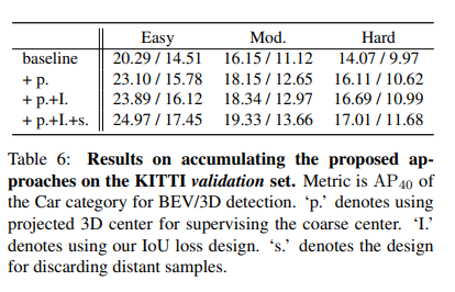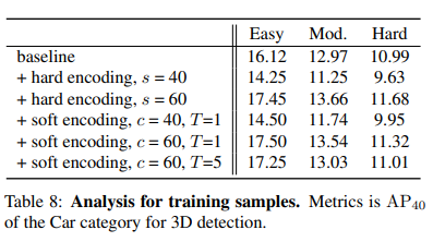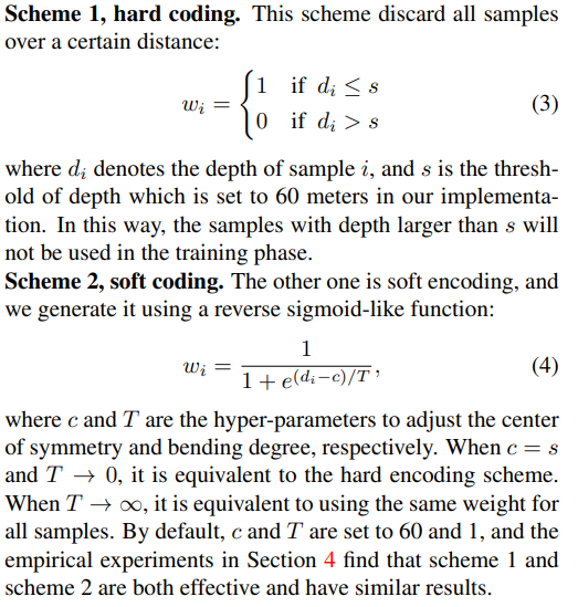 해당 표는 location shift에 따른 inaccurate center detection 성능을 나타냅니다. 거리가 멀어질수록 조금만 shift가 발생하여도 부정확성이 증가하는 것을 알 수 있습니다. 저자는 이러한 분석을 토대로 coarse center c에서 3D center와 2D center를 estimate 하기위한 offset을 예측하는 center detection을 제안합니다. 저자는 이를 통해서 2D와 3D 특성 모두를 배울 수 있다고 합니다. 동시에 거리가 멀리있는 object에 대해서는 학습과정에서 제거하는 형태의 학습방식을 이야기합니다. (Training Samples) 이때 거리의 기준은 60m로 설정하였고, hard coding과 soft coding 2가지 스키마를 이용해 설계하였습니다.