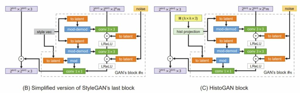 여기서 HistoGAN은 기존 StyleGAN이 Style Vector를 AdaIN하는 것을 참고하여 마지막 2개의 Block에서만 Style Vector 대신 Histogram Feature를 사용하고자 했습니다.