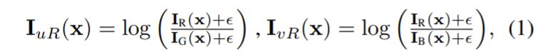 Log-chroma Space로 투영시키는 방식에 대해서 조금 더 자세히 알아보자면, 먼저 입력 영상 \bold{I}에 대하여 주 채널을 정해야 합니다. 해당 예시에서는 R 채널을 주 채널로 정한다면 나머지 두 채널(G, B)를 통해 주 채널을 normalizing해주어야 하며 이는 다음과 같습니다.