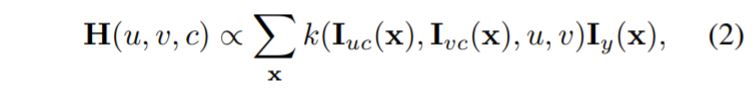 그래서 저자는 RGB-uv 히스토그램이 미분가능하도록 하기 위해 아래와 같이 Kernel Weighted Contribution 연산을 사용했다고 합니다.