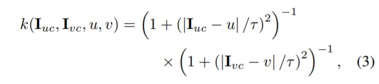 c는 R, G, B 각 채널들을 의미하며 k(\dot) 는 Pre-trained Kernel을 의미합니다. 해당 커널은 가우시안 커널을 사용해도 무방하나, 저자는 특별히 아래 수식과 같이 정의된 Inverse-quadratic Kernel을 사용했다고 합니다.