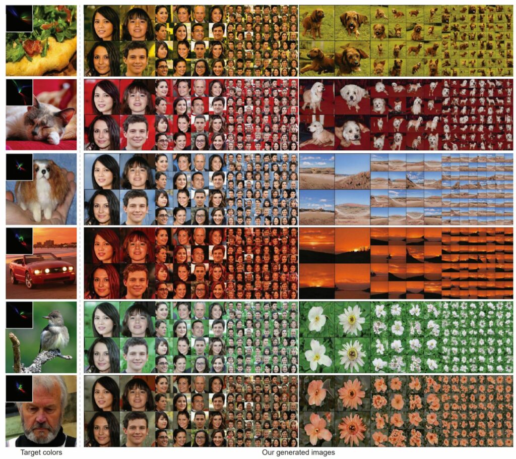 이는 StyleGAN과 같이 Latent space에서 임베딩 벡터를 가져와 새로운 영상을 생성하는 것이기 때문에 Colorization처럼 회색 영상을 입력해서 컬러를 입히는 그런 개념은 아닌 latent vector를 통해 새로운 영상을 생성할 때, 생성하고자 하는 영상의 색 분포를 지정한다고 생각하시면 좋을 것 같습니다.