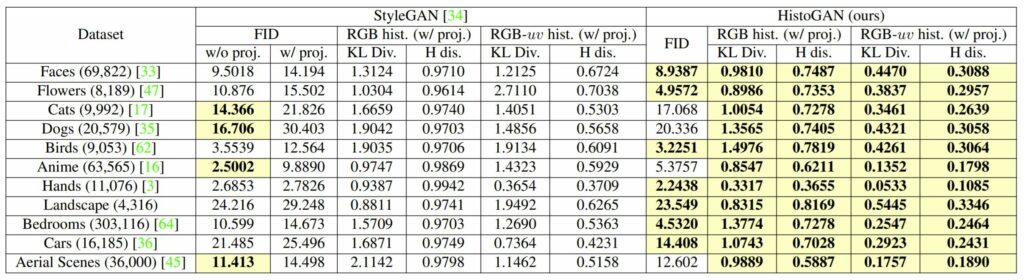 아무래도 HistoGAN이 StyleGAN의 구조에서 Histogram Feature를 사용하는 기법을 새로 추가하다보니 실험 리포팅도 기존 StyleGAN과 비교하는 모습입니다. 먼저 첫번째 열은 Image Generation을 하고자 하는 카테고리를 나타낸 것이며, 평가 메트릭으로는 FID 그리고 RGB, RGB-uv 히스토그램이 있습니다. FID를 제외한 두 히스토그램 메트릭은 생성된 영상과 Target 영상의 히스토그램에 대하여 Hellinger Distance와 KL Divergence를 계산하여 color error 값을 추정한 것입니다.