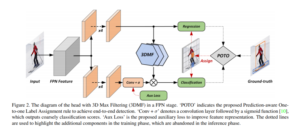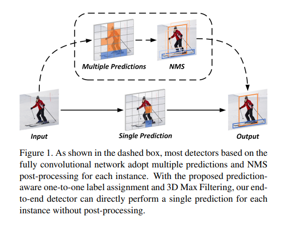 그래서 티저영상인데 해당 그림이 의미하는 바는 위에 dotted line으로된 box는 기존의 nms 과정을 통한 prediction을 이야기하고있는 것이고, 아래는 해당논문에서 사용하는 one-to-one, 즉 single prediction 방식입니다. 차이점이라고하면 기존에는 prediction값을 sliding윈도우를 태우는 방식으로 쭉 스캔하며 multiple prediction을 하였는데, 해당 논문에서 제안하는 방식은 only single prediction만을 하여 false positive를 제거하는 nms과정을 할 필요가 없다는 것에 있습니다.