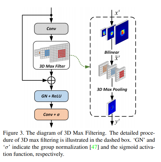 우선 가장 핵심적인 contribution인 3DMF라는 모듈이 가운데 있는데 이는 3D max pooling의 약자로 밑에서 다시 다루겠습니다. Inference를 할때는 점선영역이 사라지고, training할때는 점선도 포함하여 GT값을 이용한 loss를 최적화시키는 방향으로 학습합니다.